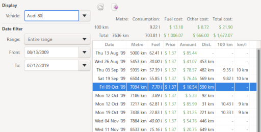 Open the vehicle cost report, select 'Audi 80' Vehicle and view the results.